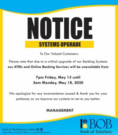 Please note that our ATMs and Online Banking services will not be available from 7 pm Friday, May 15 until 5 am Monday, May 18, 2020 due to a critical system upgrade. We apologize for any inconvenience caused and thank you for your patience as we ...