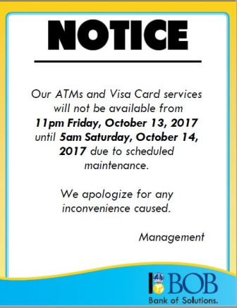 Please note that maintenance of our ATM and VISA Card Services is schedule for 11 pm Friday, October 13 until 5am Saturday, October 14, 2017.
